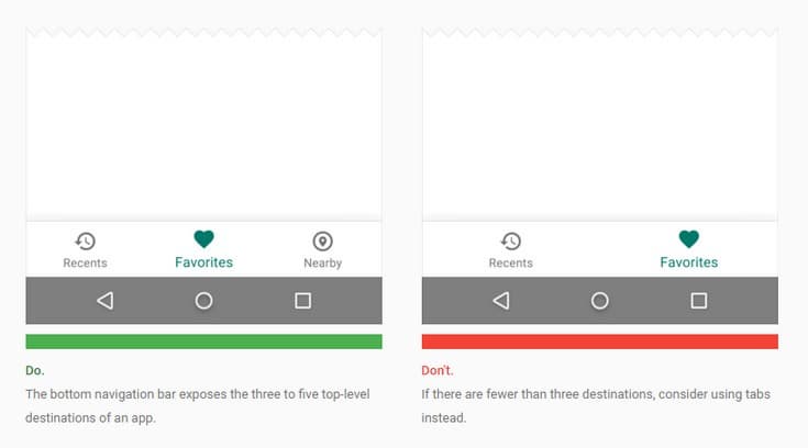 Одно из самых значимых нововведений — нижняя навигационная панель. Google предлагает использовать её в приложениях для упрощения навигации по программе. В панели предлагается размещать от трёх до пяти элементов. Компания не советует использовать нижнюю панель с большим количеством элементов, которые придётся пролистывать. Если элементов всего два, то Google советует ограничиться иными способами обеспечения доступа к этим вкладкам. Также в спецификациях указаны и другие советы, как реализовать идею нижней навигационной панели.