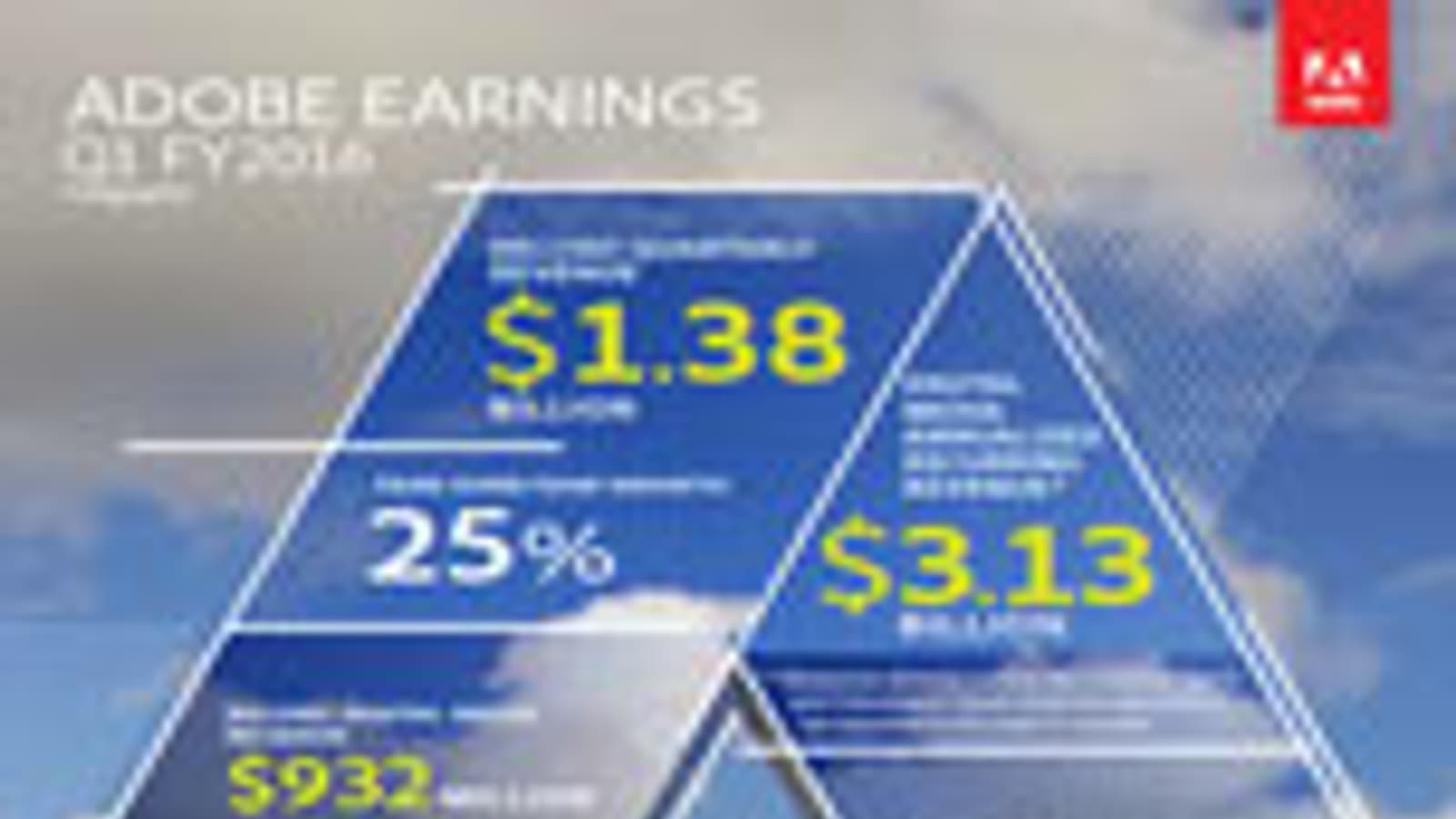 Компания Adobe опубликовала отчет за первый квартал 2016 финансового года, который у нее завершился 4 марта. За отчетный период был получен доход в размере 1,38 млрд долларов. Это на 25% больше, чем в первом квартале 2015 финансового года.