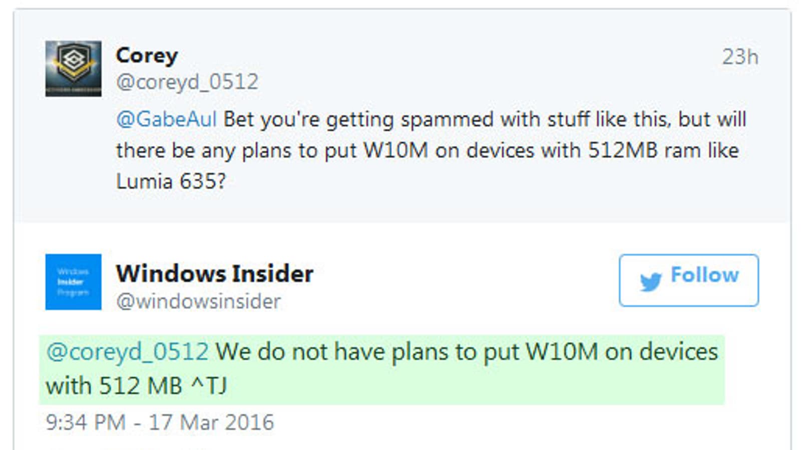 Отметим, ранее ожидалось, что операционную систему Windows 10 Mobile можно будет установить на смартфоны с 512 МБ оперативной памяти; руководство компании подтверждало, что Microsoft старается заставить Windows 10 работать на смартфонах с 512 МБ оперативной памяти, а на странице с минимальными требованиями и сейчас указано 512 МБ оперативной памяти.