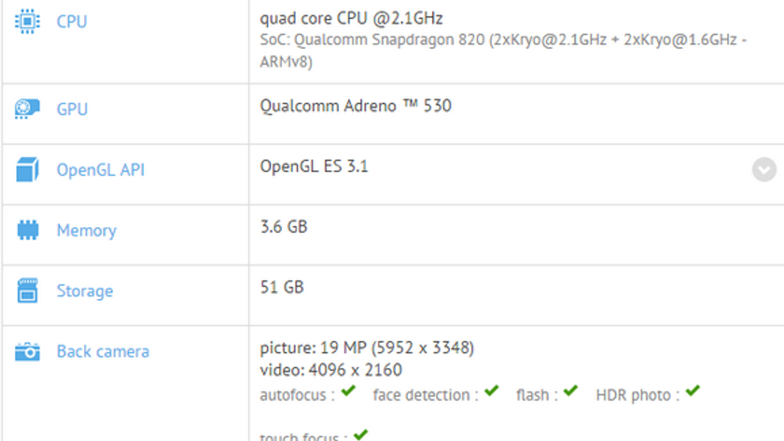 Аппарат оснастят экраном разрешением 2560 х 1440 пикселей. Указание диагонали можно пропустить. Сердцем послужит новейшая SoC Snapdragon 820, дополненная 4 ГБ ОЗУ и 64 ГБ флэш-памяти.