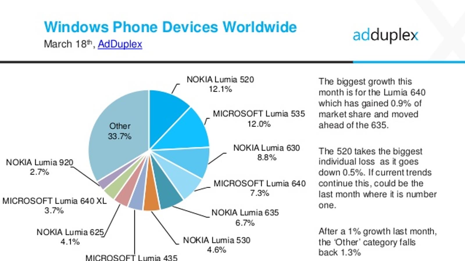 Также можно отметить, что устройства Nokia и Microsoft занимают 97,21% рынка смартфонов с Windows Phone. А 81,1% всех использующихся ныне устройств всё ещё работают под управлением Windows Phone 8.1.