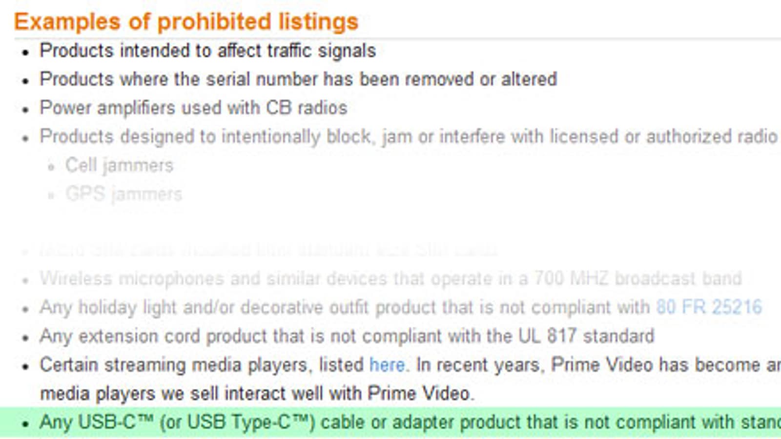 Онлайновый магазин Amazon, предоставляющий свою площадку сторонним продавцам, обновил список товаров, которые запрещены к продаже. В новой редакции списка появились кабели и переходники с разъемами USB-C, которые не соответствуют стандарту.