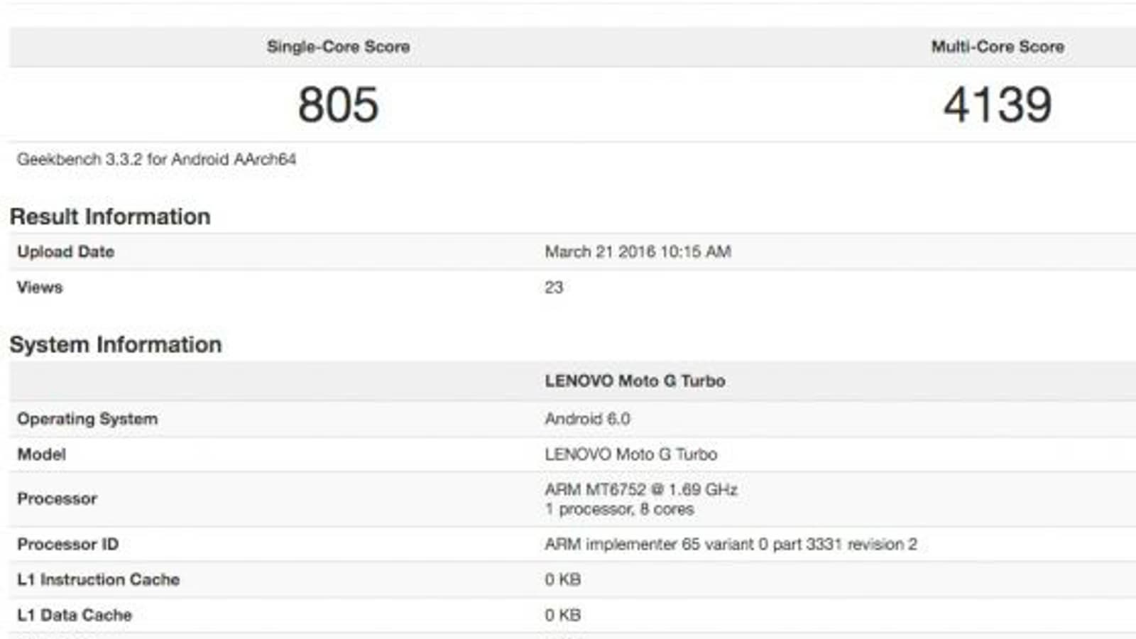 По данным бенчмарка, новый Moto G Turbo имеет 2 ГБ оперативной памяти и работает под управлением ОС Android 6.0.