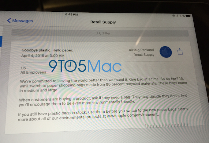 Очередным шагом данной политики станет отказ от традиционных пластиковых пакетов, которые хорошо знакомы покупателям продукции Apple. Ресурс 9to5Mac опубликовал разосланное сотрудникам Apple письмо, в котором говорится о том, что 15 апреля во всех магазинах должны начать использоваться новые бумажные пакеты, которые на 80% состоят из переработанных материалов.