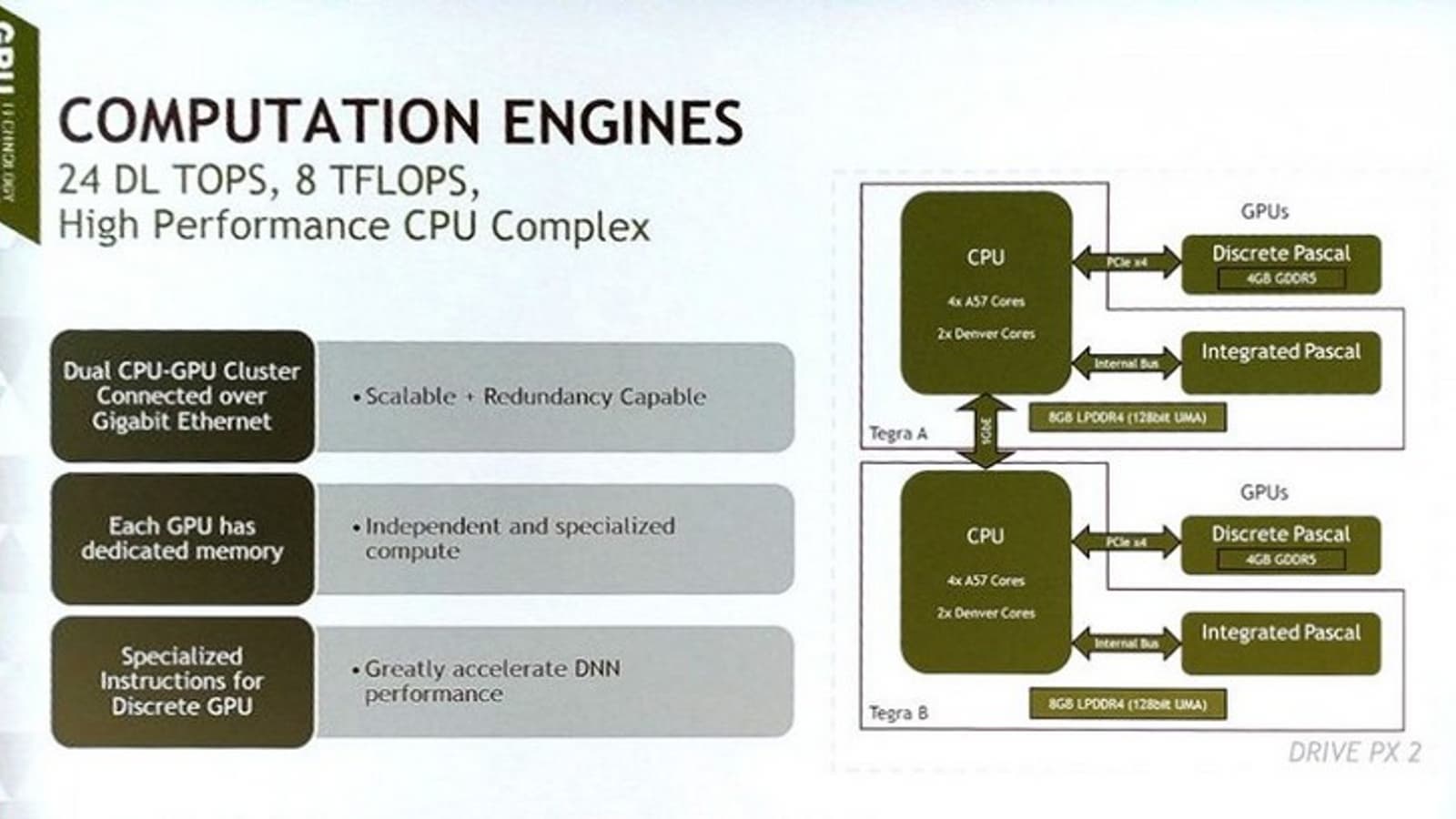 Но и это не всё. Каждая однокристальная система Tegra соединена с отдельным GPU поколения Pascal (используется PCIe 3.0 x4). Каждый такой GPU в свою очередь соединён посредством 128-разрядной шины с 4 ГБ памяти GDDR5, которая способна работать на частоте до 6000 МГц. Конфигурация этого GPU также пока остаётся тайной.