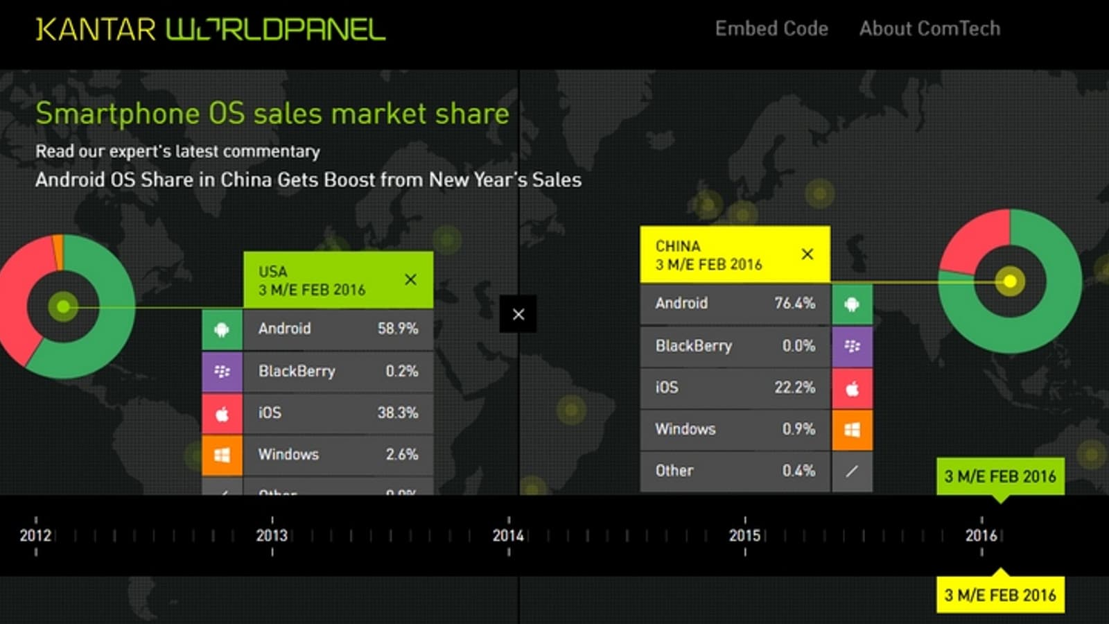 Новая порция информации Kantar касается периода в три месяца, завершившегося в начале февраля. Если верить этим данным, доля iOS на большинстве рынков несколько снизилась по сравнению с аналогичным периодом прошлого года.