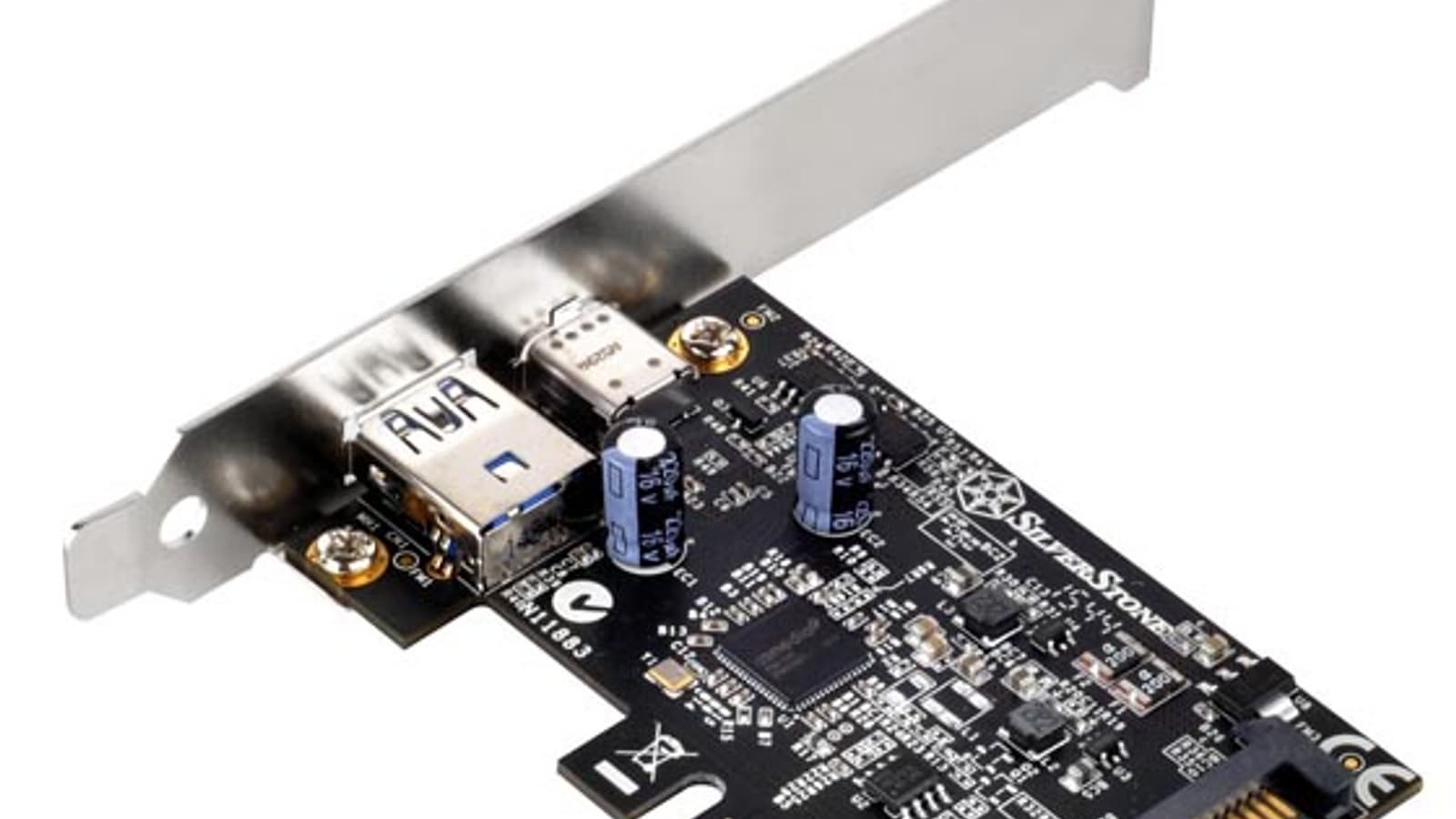 Тем, для кого пять дополнительных портов USB 3.0 и USB 3.1 — это много, компания SilverStone предлагает карту расширения ECU03. Она позволяет добавить в конфигурацию ПК всего два порта, но оба они соответствуют спецификации USB 3.1. Как можно видеть на иллюстрации, на монтажной планке расположено по одному разъему USB-A и USB-C.