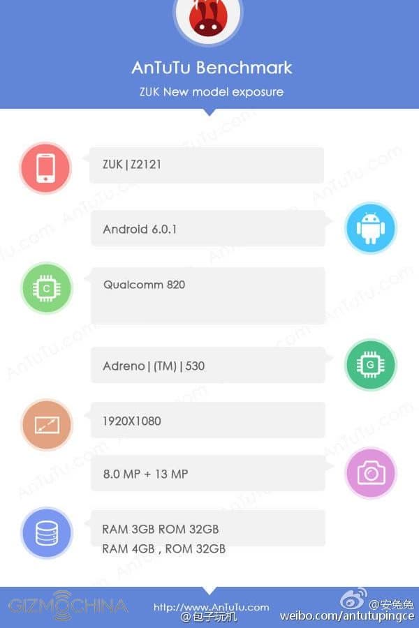 Ранее Zuk Z2 Pro появился под модельным номером Zuk Z2121 в базе данных тестового пакета AnTuTu, который обнародовал его основные характеристики. Смартфон будет оснащен однокристальной системой Snapdragon 820, диагональ дисплея пока что остается неизвестной, но его разрешение должно составить 1920 х 1080 пикселей.