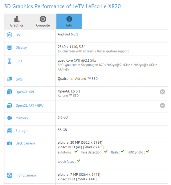Очередным носителем немалого даже по меркам ПК объёма ОЗУ станет смартфон LeEco Le X820. Под таким именем он попал в базу GFXBench. Возможно, в продажу он поступит под названием Le 2 Max.