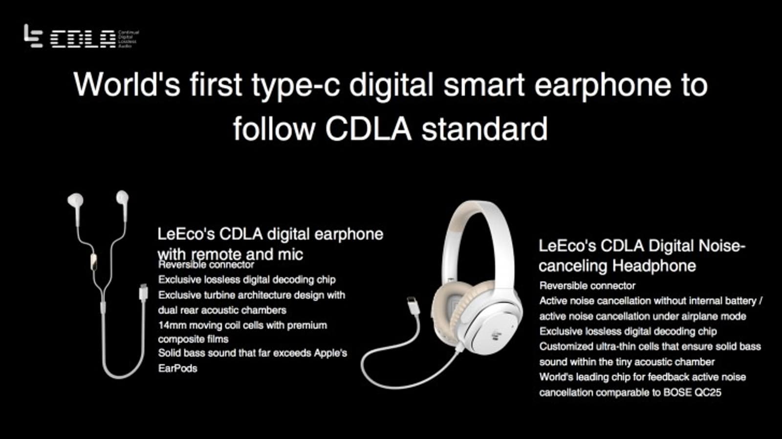 Сегодня же китайская компания LeEco, анонсировав сразу несколько смартфонов без разъема 3,5 мм, о чем вы сможете прочитать в нашей ленте чуть позже, также представила наушники, которые подключаются через симметричный разъем USB-C, а также стандарт CDLA (Continual Digital Lossless Audio), уже сертифицированный Китайской ассоциацией музыкантов (Chinese Musicians' Association). Порт USB-C позволяет транслировать несжатое аудио на декодер, который располагается внутри наушников. Большинство аналоговых наушников с системами активного шумоподавления требуют наличия источника питания, который не нужен наушникам с разъемом USB-C.