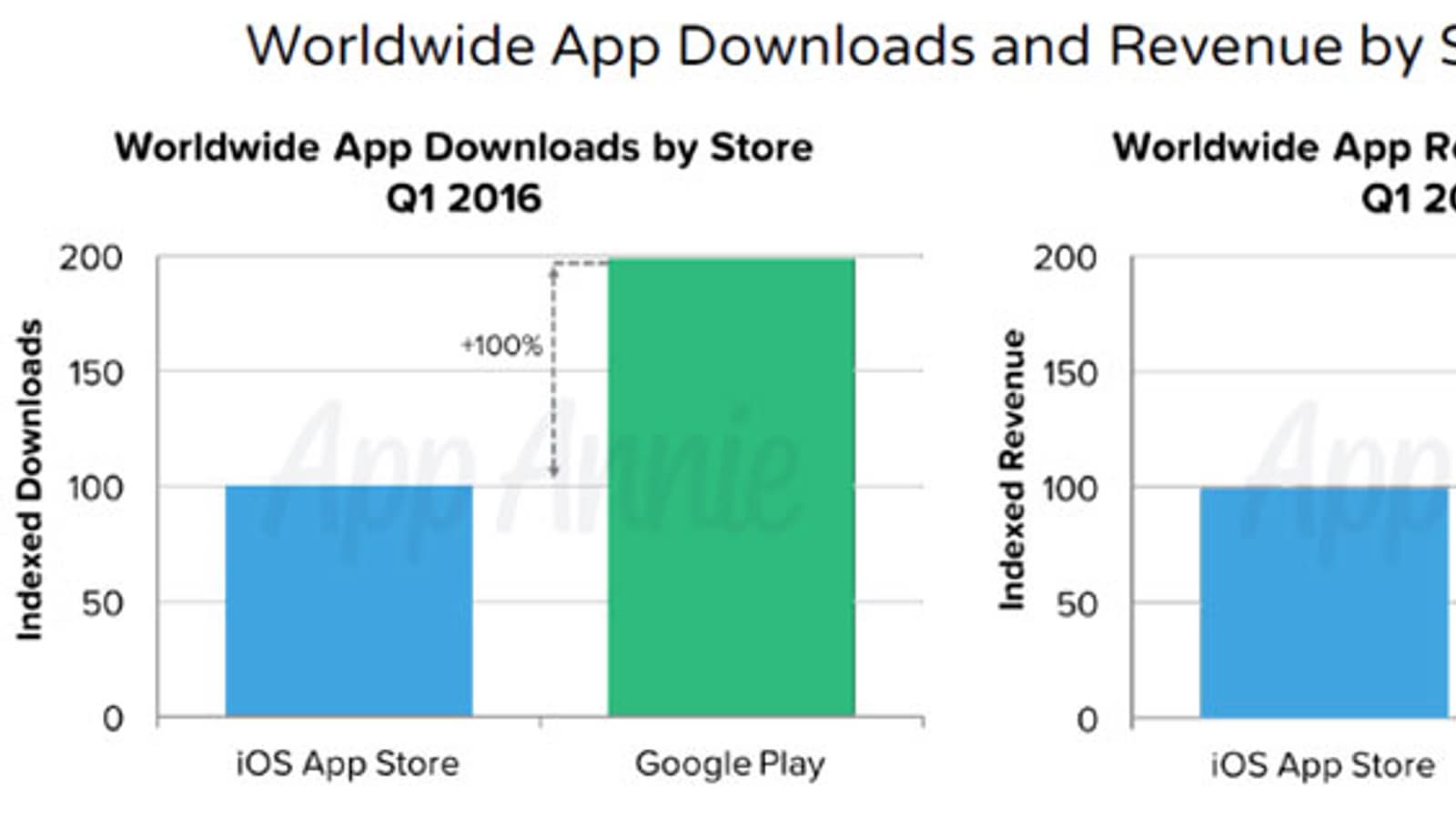 Как мы уже сообщали, за минувший квартал приложения из магазина Google Play были скачаны более 11 млрд раз. По данным источника, это вдвое больше числа загрузок из магазина Apple iOS App Store за тот же период. Однако, если сравнивать не количество загрузок, а доход, магазин Apple вдвое превосходит магазин Google.