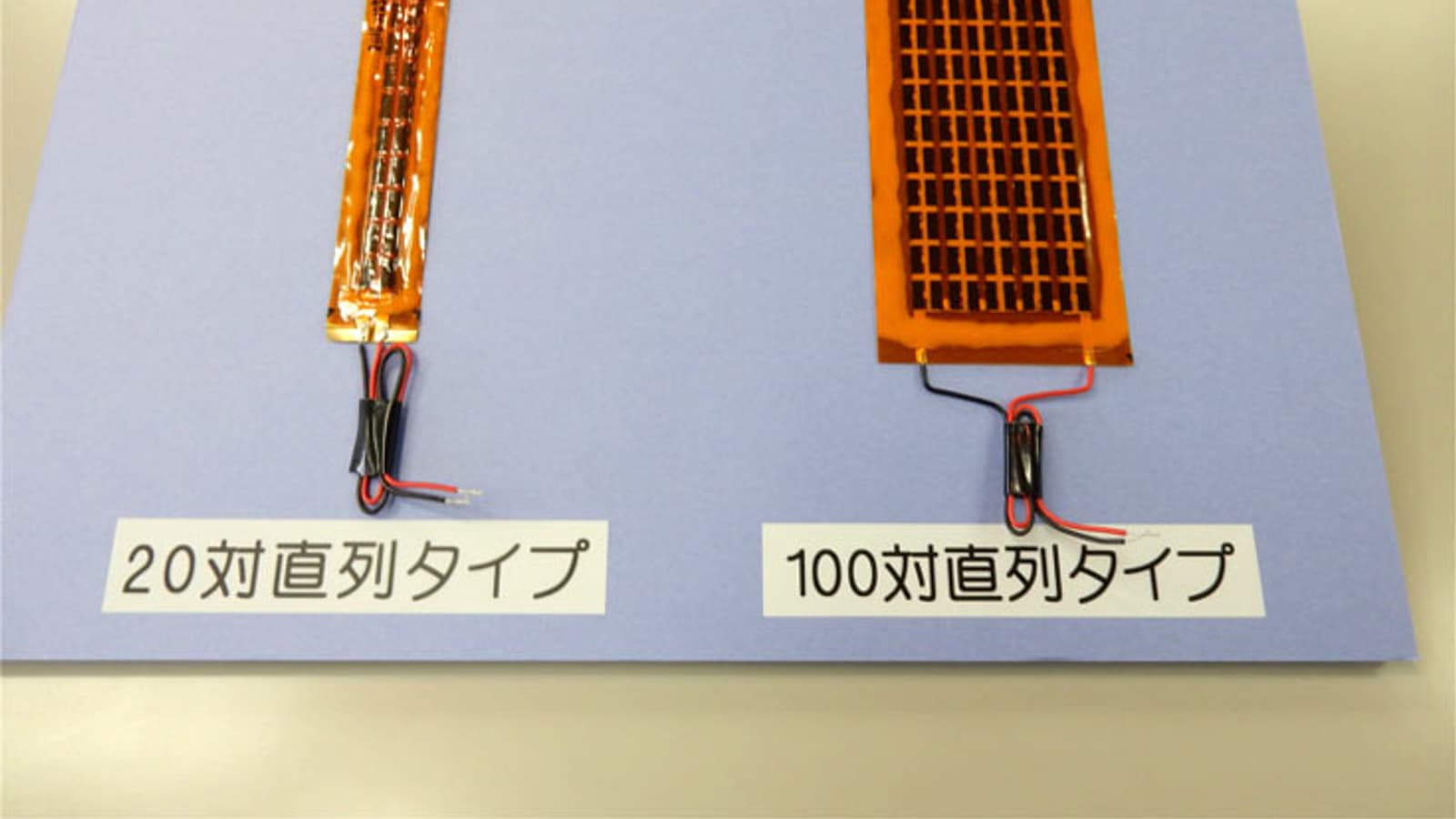 Показанный на иллюстрации прототип размером с пластиковую карту может вырабатывать мощность до 475 мкВт. Его основой служит нетканый материал. Гибкость листа такова, что его можно обернуть вокруг трубы диаметром 5 см. Разработчики надеются уменьшить толщину термоэлектрогенератора, что даст возможность устанавливать его на поверхности сложной формы.