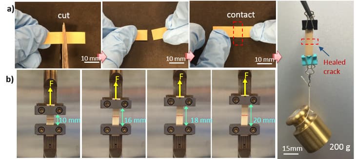 Авторы проекта считают, что подобный материал может найти применение в медицине, спорте и носимой электронике. На представленных в данной заметке материалах видно, что полоска, изготовленная из этого материала, восстанавливается даже после того, как ее разрезают на две части. После чего она может растягиваться и удерживать определенный груз.