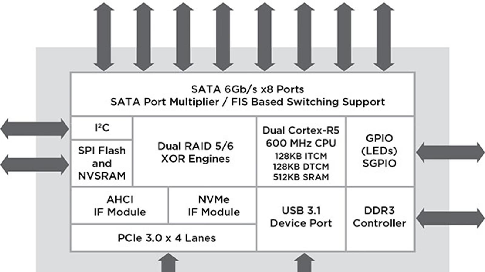 Компания Marvell представила семейство контролеров RAID Marvell 88RC13xx. Эти контроллеры оснащены восемью портами SATA 6 Гбит/с, четырьмя линиями интерфейса PCI Express 3.0 и портом USB 3.1 с поддержкой USB-C.