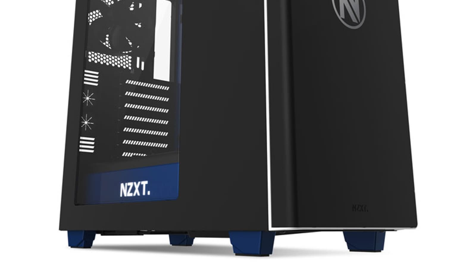 Напомним, в корпусе отсутствуют отсеки типоразмера 5,25 дюйма, за счет чего значительная часть передней стенки отведена под вентиляторы: здесь расположено три 120-миллиметровых вентилятора NZXT FNv2. Четвертый такой же закреплен на задней стенке. Переднюю панель украшает эмблема команды EnVyUs.