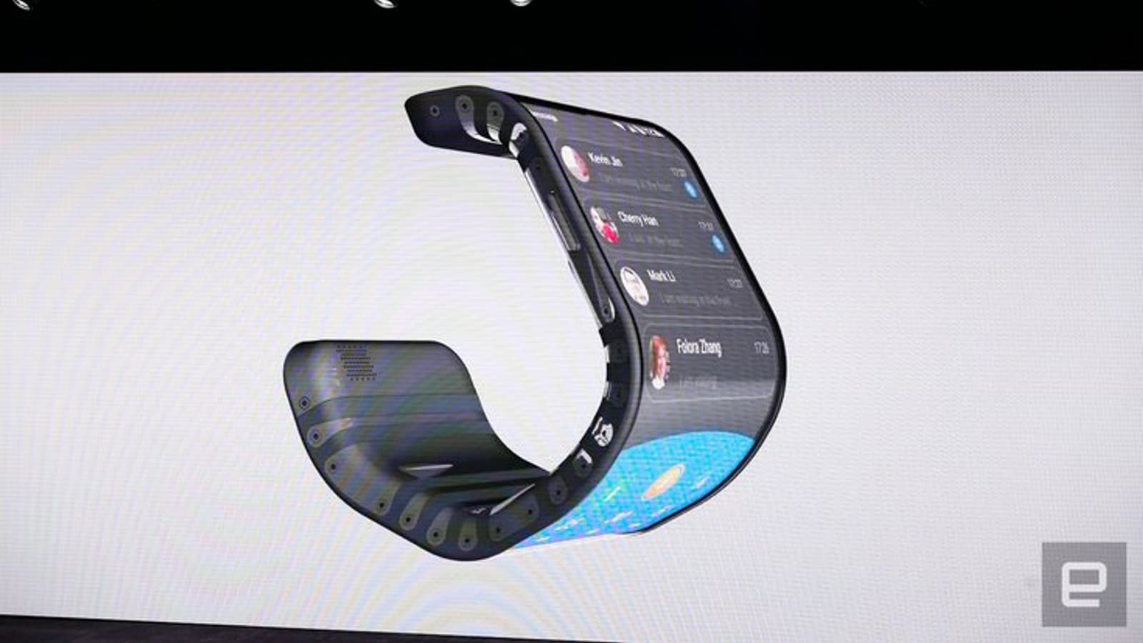 В начале мероприятие приглашённая звезда Меган Маккарти (Megan McCarthy) продемонстрировала гибкий смартфон и складывающийся планшет. Планшет можно было сложить пополам, а вот смартфон Маккарти просто обернула вокруг запястья.