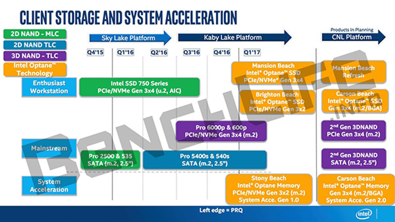 Компания Intel сопроводит процессоры новой платформы Kaby Lake новыми же линейками твердотельных накопителей. Согласно дорожной карте, опубликованной источником, практически одновременно с процессорами Kaby Lake дебютируют SSD серий Pro 6000p и 600p, ориентированные на массового пользователя, а к концу года появятся уже демонстрировавшиеся ранее высокоскоростные SSD Optane.