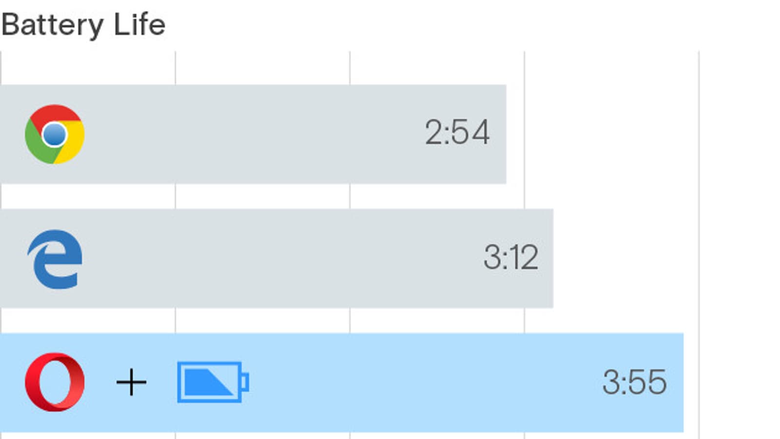 Результат оказался неудивительным: победителем стал браузер Opera с результатом 3 часа 55 минут, второе место досталось Microsoft Edge, который проработал 3:12, а Chrome продемонстрировал результат 2:54.