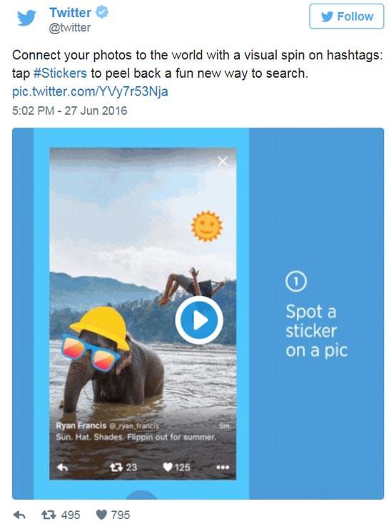 В списке возможностей, предоставляемых социальной сетью Twitter, появилась функция #Stickers. Она дает возможность накладывать на фотографии «наклейки» — небольшие изображения, которые можно масштабировать и поворачивать. На одном фото может быть несколько наклеек.