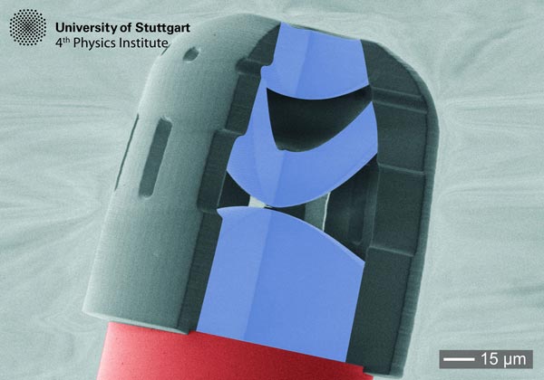 Специалистами, работающими в университете Штутгарта, разработана технология изготовления микроскопических оптических элементов и систем методом трехмерной печати. Секрет разработки — сверхкороткие лазерные импульсы и отверждаемый их воздействием жидкий материал. С их помощью удается формировать объективы диаметром с человеческий волос.