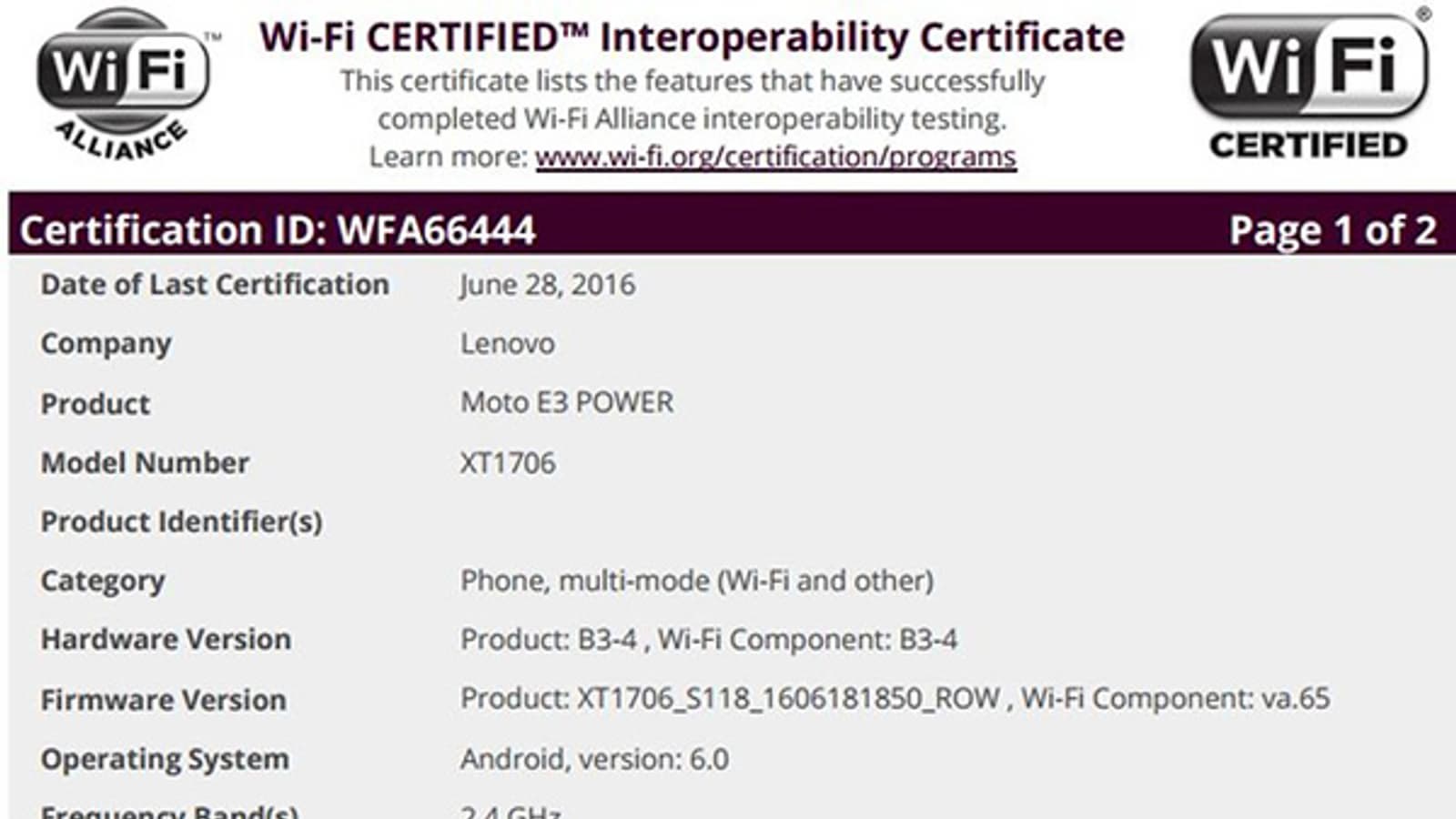 В скором времени линейка смартфонов Moto пополнится моделью Moto E3 Power (ее каталожный номер — XT1706). Смартфон уже прошел сертификационные испытания Wi-Fi Alliance.