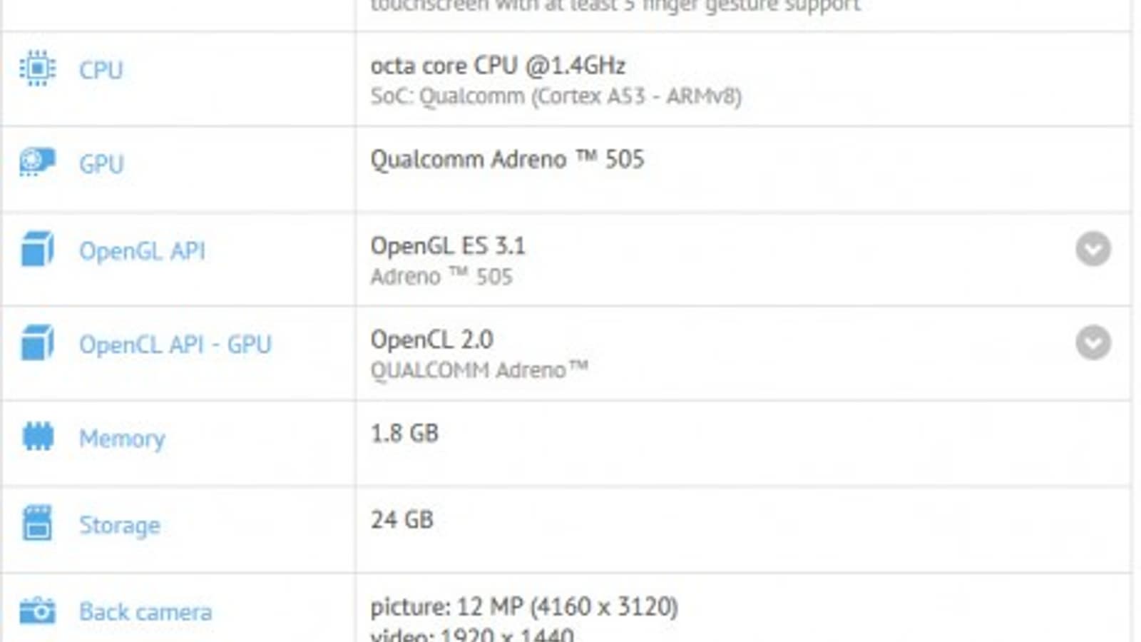 Аппарат с ОС Android 6.0.1 Marshmallow построен на SoC Qualcomm Snapdragon 435 и оснащен 2 ГБ оперативной памяти и 32 ГБ флэш-памяти. Он имеет экран Full HD размером 5,5 дюйма, камеры разрешением 12 и 8 Мп.