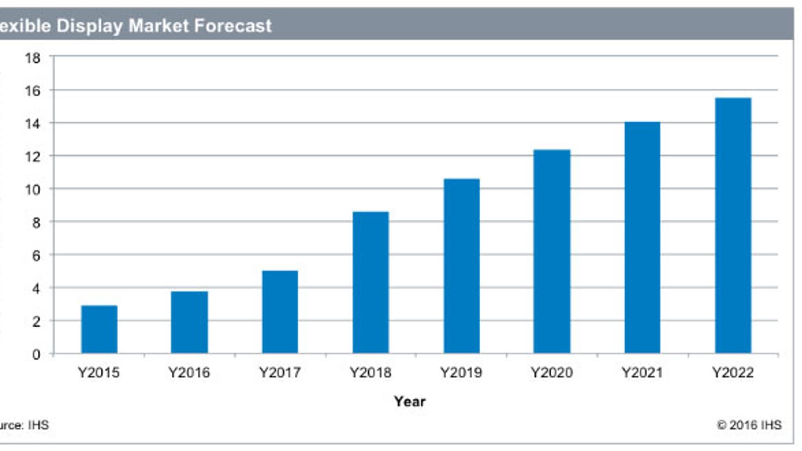 По прогнозу IHS, объем рынка гибких дисплеев в денежном выражении в этом году составит 3,7 млрд долларов, а в 2022 году он достигнет 15,5 млрд долларов.