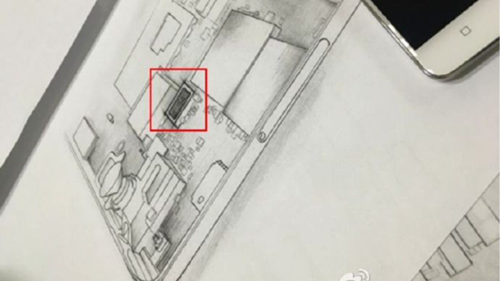 Обведённая красным микросхема у источника вызвала вопросы, так как якобы не является никаким из привычных нам компонентов. В принципе, рисунок не заслуживал бы ни капли внимания, если бы источник не ссылался на некие слухи касательно нового смартфона.