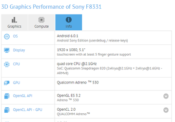 В базе данных GFXBench замечен смартфон Sony F8331, оснащенный SoC Snapdragon 820