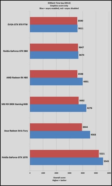 Так вот тесты показывают, что архитектура AMD, причём даже относительно неновая, лучше оптимизирована под асинхронные вычисления и получает больший прирост при активации подобного режима. У Nvidia ситуация хуже. Архитектура Maxwell, видимо, вовсе не поддерживает такую технологию, а Pascal хоть и получает прирост, но он вдвое меньше, нежели у карт AMD.