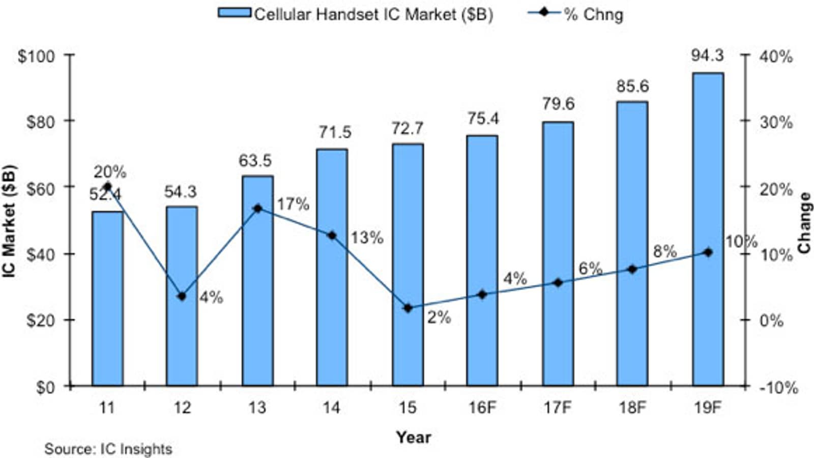 Специалисты аналитической компании IC Insights дали прогноз на период до 2019 года, касающийся рынка микросхем для сотовых телефонов. По мнению аналитиков, в указанный период рынок будет расти в среднем на 6,7% в год. В 2019 году он достигнет 94,3 млрд долларов. Это примерно на 30% больше показателя 2015 года.