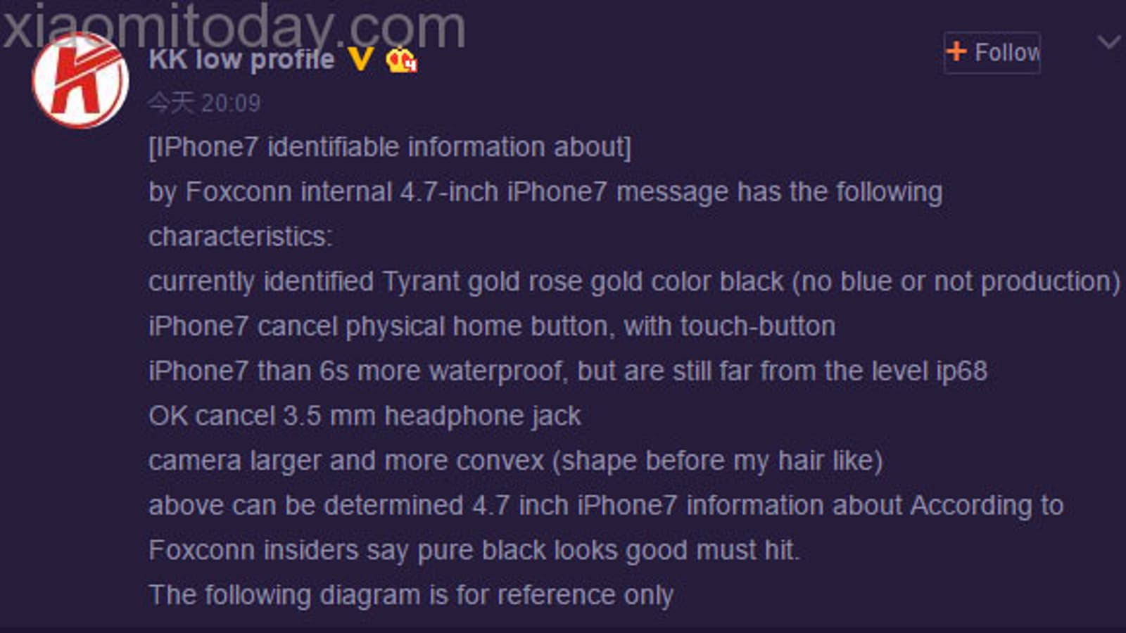 Анонс смартфона Apple iPhone 7 ожидается в сентябре, а пока тематические ресурсы продолжают генерировать поток новостей с крохами информации об устройстве. Источник опубликовал сведения, как утверждается, полученные прямо от сотрудника компании Foxconn, являющейся фактическим производителем смартфонов Apple.