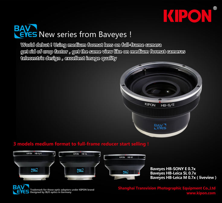 Выпуск подобных изделий, но рассчитанных на среднеформатные объективы и полнокадровые камеры, анонсировала компания Kipon. Говоря точнее, анонсировано три модели, рассчитанные на объективы Hasselblad V