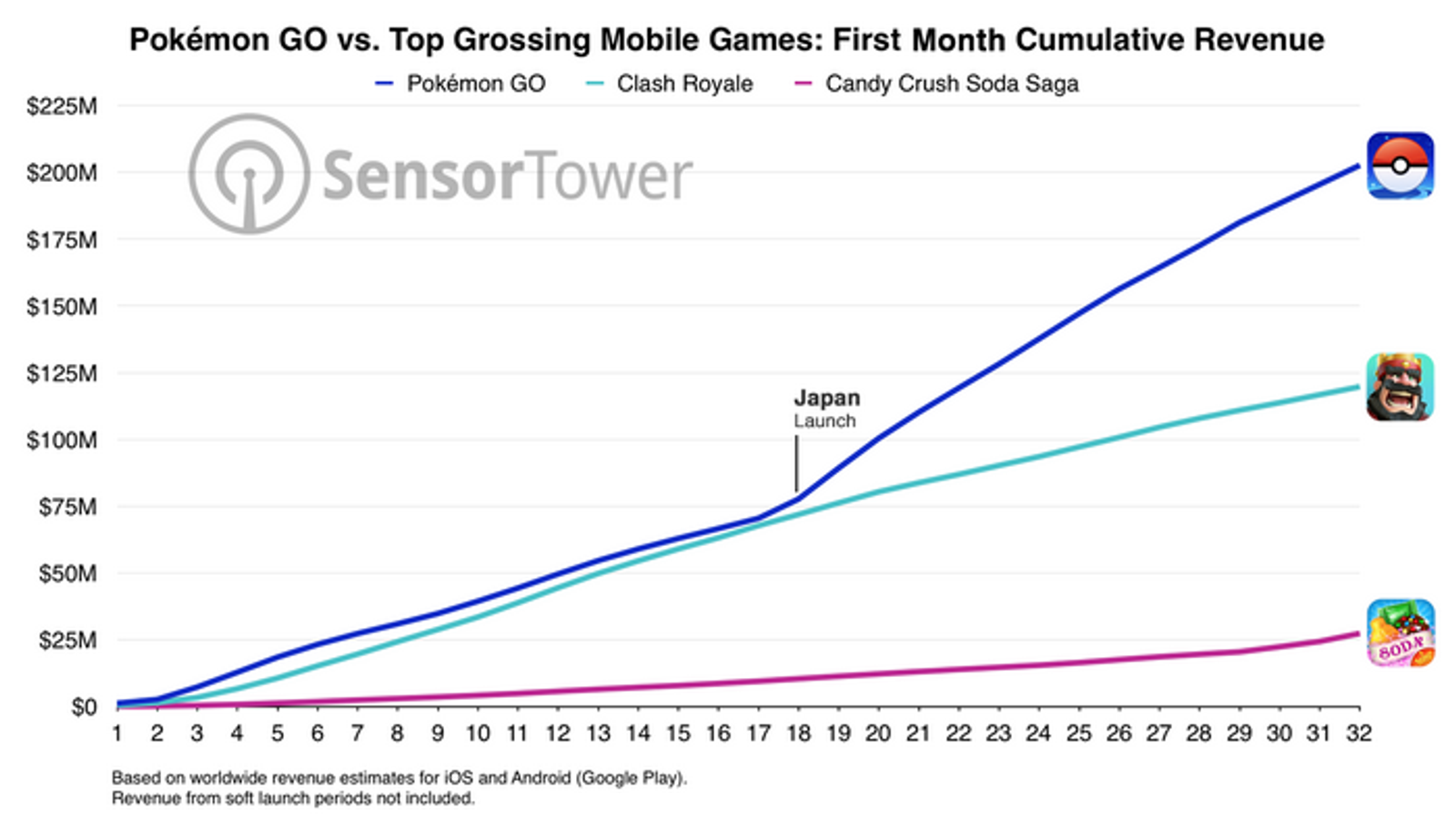 Что же послужило причиной такого всплеска? Выход игры на территории Японии, после чего Pokemon GO стала зарабатывать деньги еще быстрее, чем в течение первых двух недель.