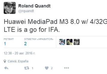 Huawei MediaPad M3 получит 4 ГБ оперативной памяти