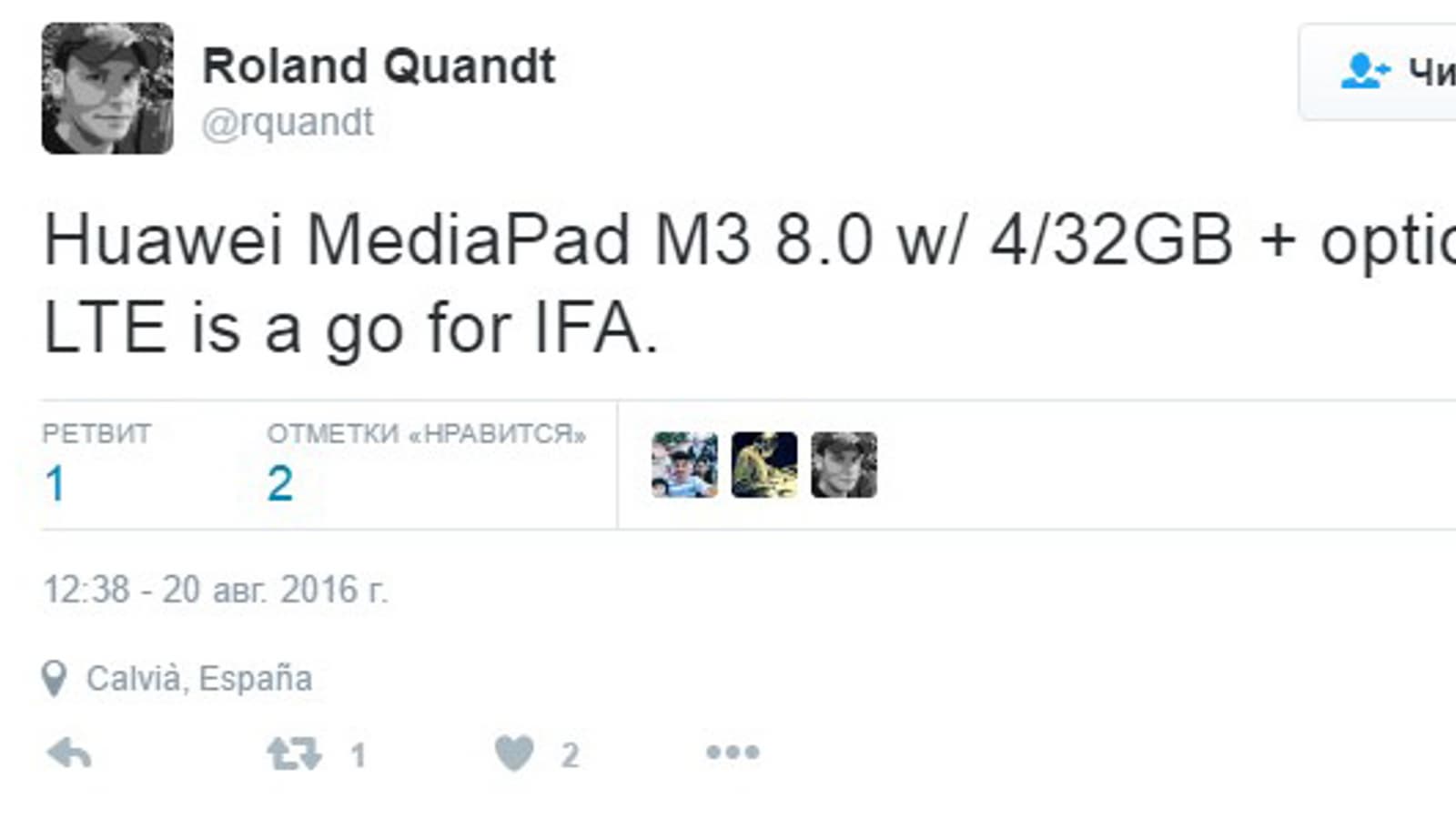 Компания Huawei работает над новым поколением планшетных компьютеров линейки M — как пишет один из пользователей Twitter, в начале сентября на выставке IFA 2016 в Берлине дебютирует MediaPad M3 с экраном диагональю 8 дюймов.