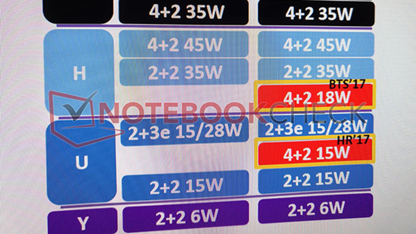 Как пишет источник, процессоры Intel Kaby Lake, помимо разных улучшений архитектуры, принесут с собой одно интересное новшество: в линейку ULV, принадлежность к которой обозначается буквой U в конце маркировки, войдут не только двух-, но и четырехъядерные модели. В доказательство этой информации источник приводит изображение слайда презентации. На нем хорошо видно, что четырехъядерные модели будут не только в топовой линейке мобильных процессоров H, но и в массовой U.