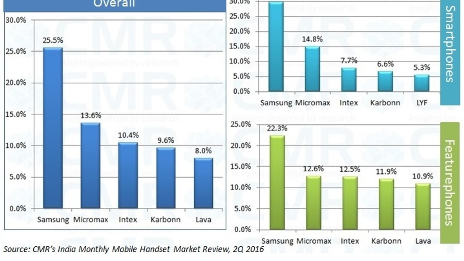 Лидером рынка смартфонов (и мобильных аппаратов в целом) является Samsung. Корейский гигант занимает 29,7% рынка Индии, намного опережая ближайшего конкурента в лице Micromax, у которого 14,8%. Замыкает тройку лидеров Intex с долей 7,7%.