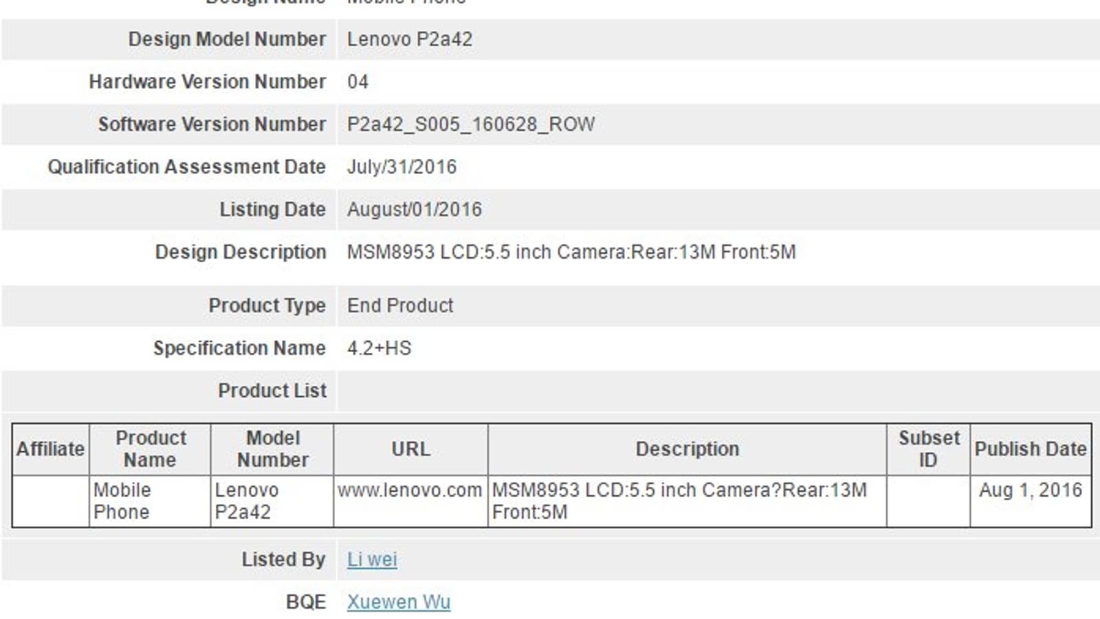 В базе данных Bluetooth Special Interest Group (SIG) замечен смартфон Lenovo с индексом модели P2a42. Аппарат, прошедший сертификацию, построен на однокристальной системе Snapdragon 625 и оснащен дисплеем размером 5,5 дюйма.