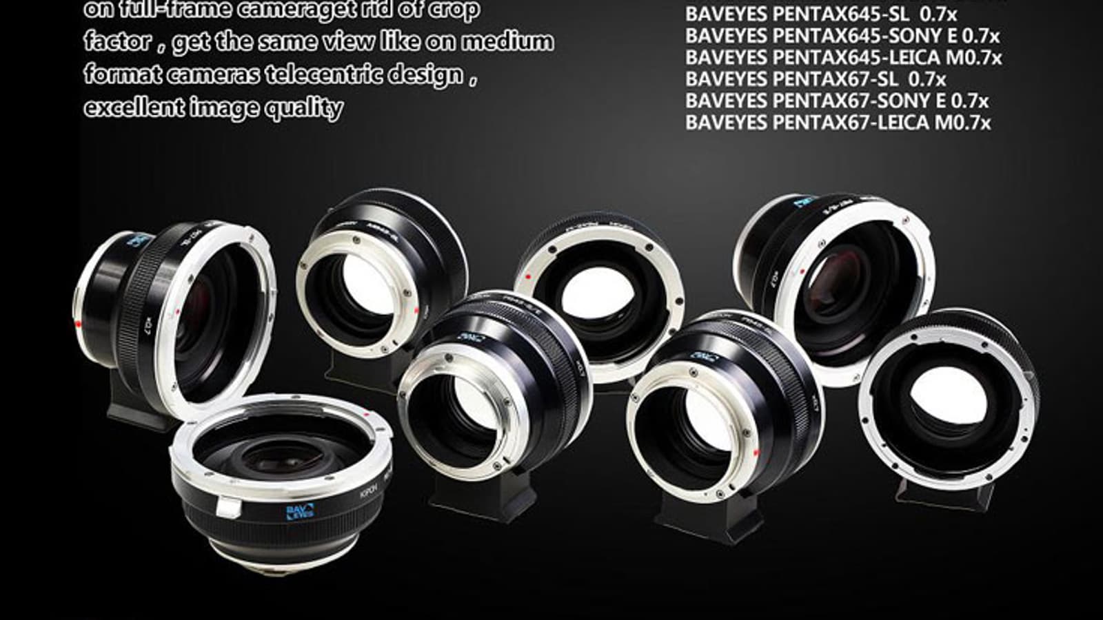 В общей сложности в ассортименте японского производителя теперь 11 моделей переходников для установки среднеформатных объективов на камеры Sony и Leica. Их список выглядит так: Baveyes Hasselblad-Sony E 0.7x, Baveyes Hasselblad-Leica M 0.7x, Baveyes Hasselblad-Leica SL 0.7x, Baveyes Pentax645-Sony E 0.7x, Baveyes Pentax645-Leica M 0.7x, Baveyes Pentax645-Leica SL 0.7x, Baveyes Pentax67-Sony E 0.7x, Baveyes Pentax67-Leica M 0.7x, Baveyes Pentax67-Leica SL 0.7x, Baveyes Mamiya645-Leica SL 0.7x и Baveyes Mamiya645-Sony E 0.7x.