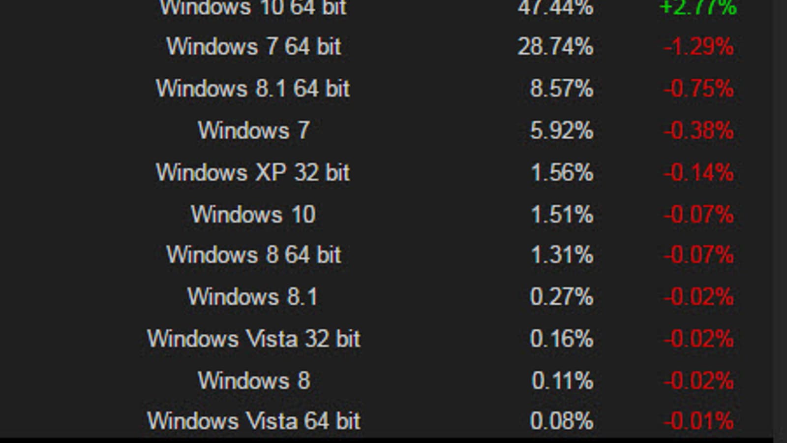 Свежие данные указывают на то, что операционная система Windows 10 уже установлена на компьютерах почти половины (48,95%) пользователей сервиса. 64-разрядную версию Windows 10 предпочитают 47,44% игроков. Доля Windows 7 сократилась до 34,66%.