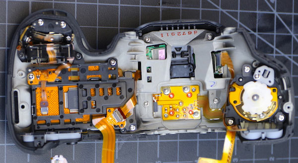 Разобрать устройство оказалось сложнее, чем ожидали исследователи. Этим оно отличается от других камер Canon, которые приходилось разбирать LensRentals. К последовательному чередованию отвинчивания порции винтиков и отделения очередного узла добавилась необходимость разборки большей части оболочки корпуса, детали которой скреплены пластиковыми защелками. Препараторы объясняют это усложнение желанием производителя обеспечить защиту камеры от атмосферных воздействий.