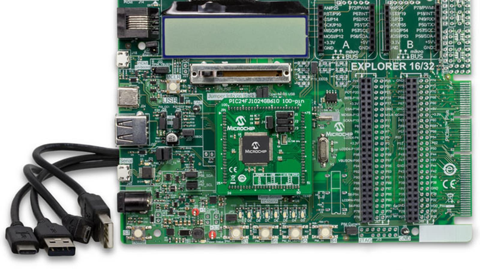 Цена набора #DM240001-3, включающего плату Explorer 16/32, модуль с микроконтроллером PIC24FJ1024GB610 и два кабеля USB, равна $110. Отдельно плата (#DM240001-2) стоит $80. Карта расширения PICtail Plus Expansion Board (#AC240100) с mikroBUS и небольшим участком для макетирования стоит $40.