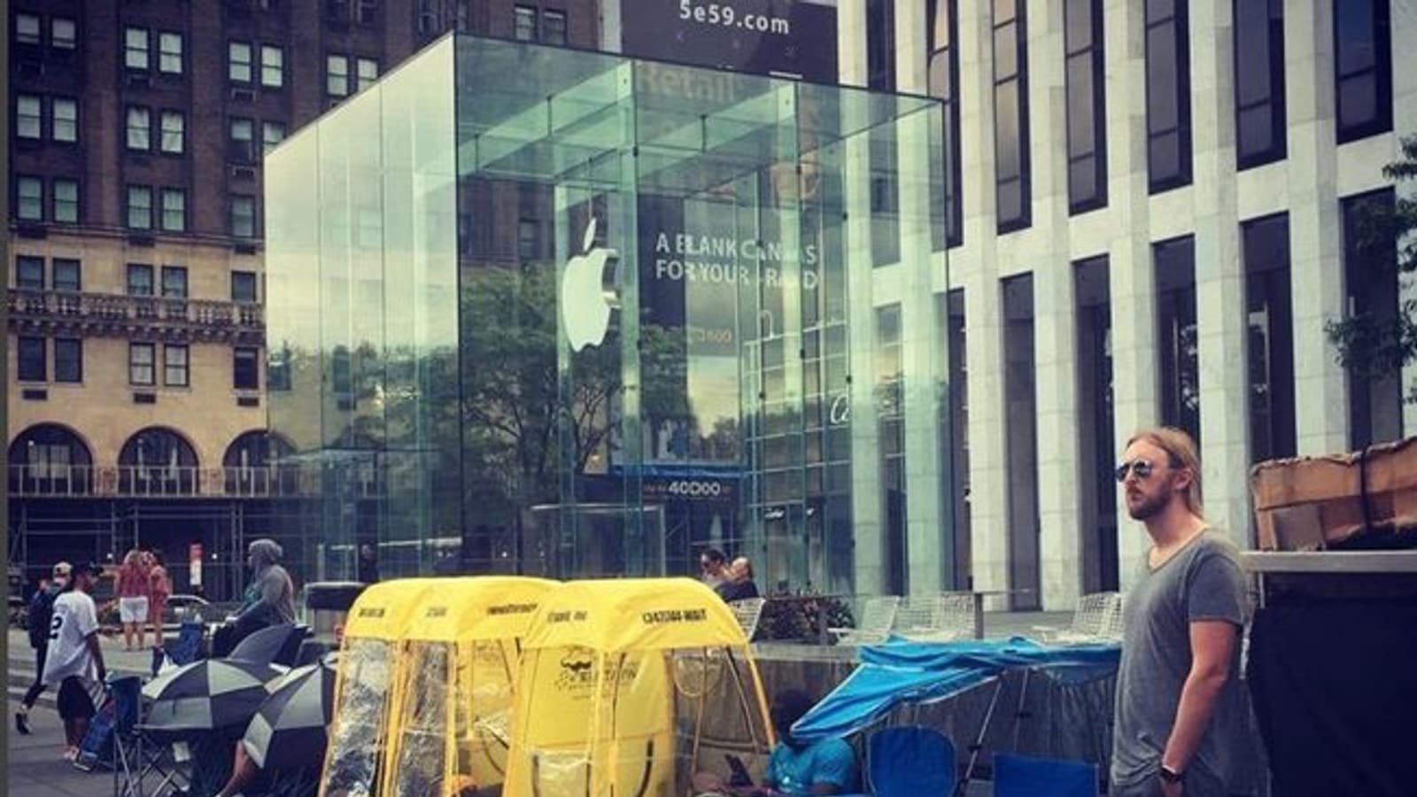 Первая фотография запечатлела людей возле флагманского магазина Apple Store на Пятой авеню в центре Манхэттена в Нью-Йорке.