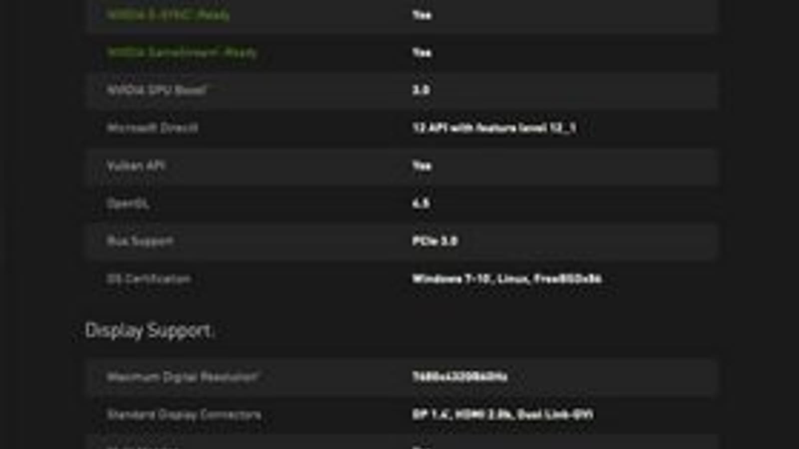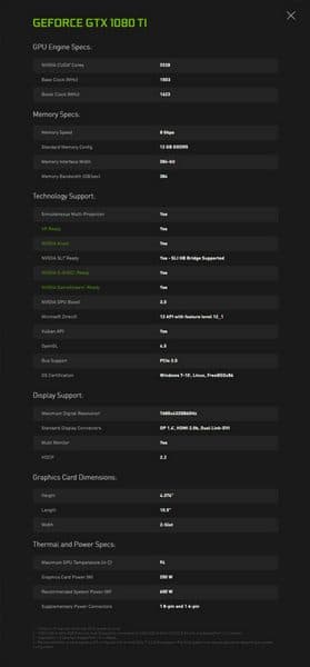 Также источник говорит о наличии 208 текстурных блоков, 96 блоков растровых операций, 12 ГБ памяти с частотой 8000 МГц, 384-разрядной шине памяти и частотах GPU 1503/1623 МГц. TDP составит 250 Вт, а для работы потребуется подключение двух разъёмов питания (8+6). Обращает на себя внимание использование памяти GDDR5 вместо GDDR5X. Видимо, в Nvidia посчитали, что пропускной способности в 384 ГБ/с, обусловленной более широкой шиной, и так хватит. Для сравнения, у GTX 1080 пропускная способность меньше — 320 ГБ/с, зато у GeForce Titan X она достигает 480 ГБ/с.