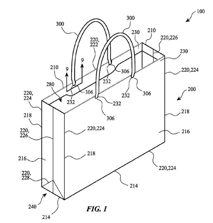 В базе данных американского патентного бюро появилась заявка на патент, поданная Apple в марте этого года. Патентуемое изобретение называется незамысловато — «сумка». В патенте описан «бумажный пакет, который может включать контейнер, сформованный из плотной отбеленной бумаги, не менее чем на 60% изготовленной из вторсырья».
