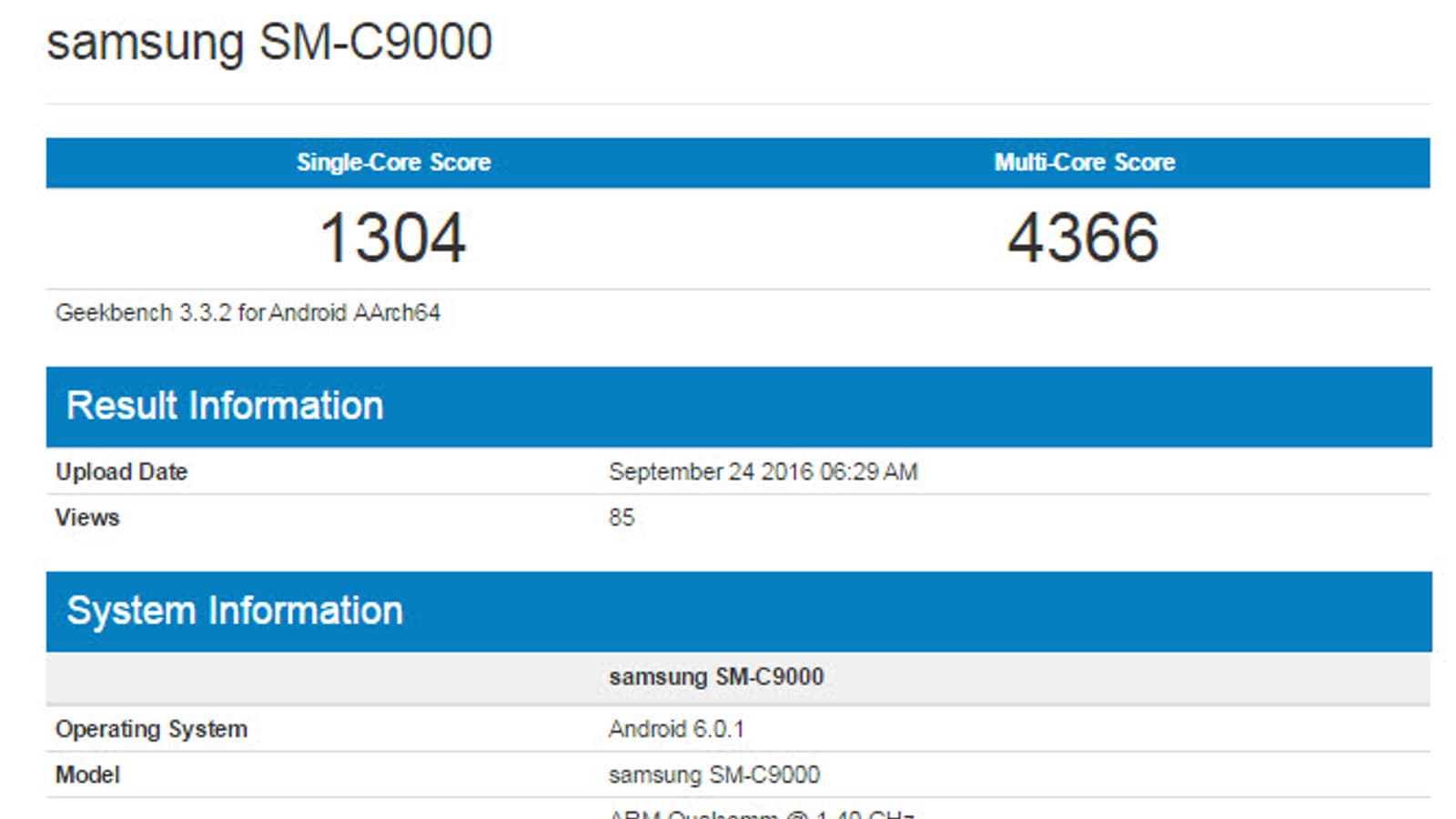Теперь же Samsung Galaxy C9 засветился в тестовом пакете Geekbench, благодаря чему стало известно, что смартфон оснащен однокристальной системой Snapdragon 652 и внушительным объемом оперативной памяти, которой у Samsung Galaxy C9 целых 6 ГБ. Протестированное устройство работает под управлением операционной системы Android 6.0.1 Marshmallow.