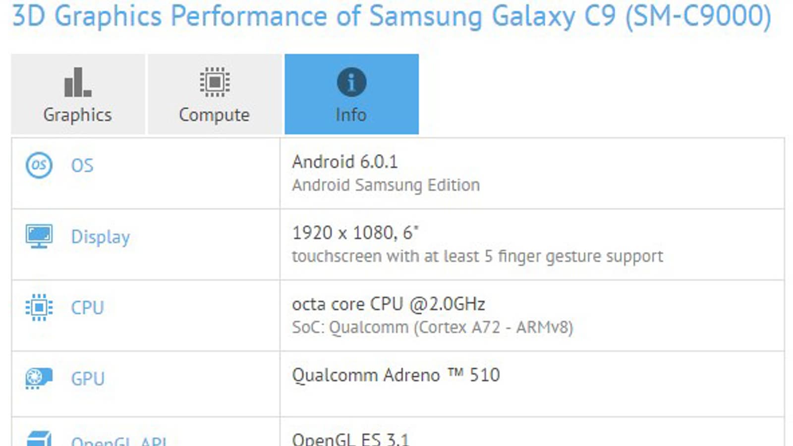 Смартфон Samsung Galaxy C9 продолжает свое турне по бенчмаркам: аппарат уже засветился в Geekbench и AnTuTu, а сейчас устройство обзавелось собственной страничкой с результатами тестов в GFXBnech.