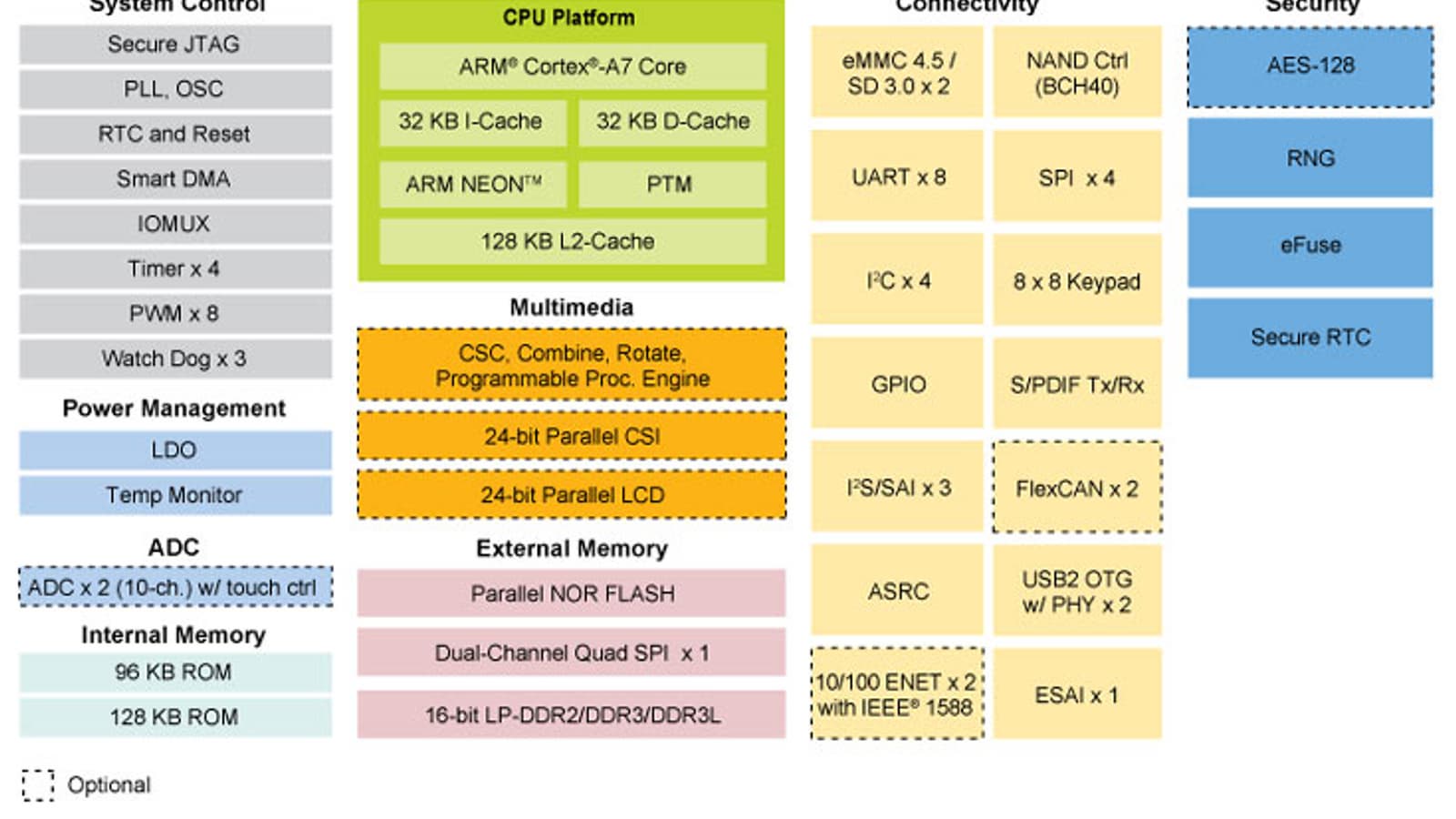 Тактовая частота ядра достигает 528 МГц. Конфигурация процессора включает 128 КБ кэш-памяти второго уровня. Предусмотрено подключение 16-разрядной памяти LPDDR2, DDR3 и DDR3. Процессор предложен в двух вариантах исполнения: в корпусе BGA размерами 14x14 мм с шагом выводов 0,8 мм и в корпусе BGA размерами 9x9 мм с шагом выводов 0,5 мм. Первый позволяет использовать более дешевые печатные платы, второй больше подходит для устройств с жесткими ограничениями по габаритам.