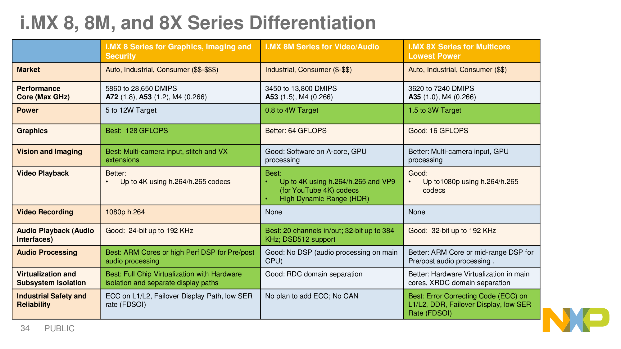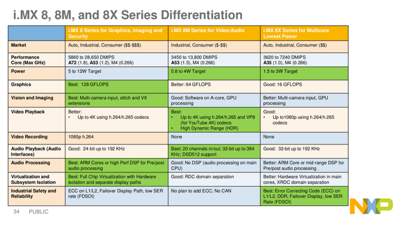 Благодаря определённым особенностям, в частности, двум графическим процессорам, новые SoC NXP позволяют ощутимо упростить разработку, тестирование и развёртку аппаратной платформы с несколькими ОС. Каждый компонент конфигурации новых SoC, начиная с графических процессоров и заканчивая последовательными портами, имеет собственную защиту ресурсов и собственную систему управления доступом. Это позволяет полностью разделить аппаратные ресурсы системы между несколькими ОС и значительно повысить безопасность и стабильность итогового устройства. Однокристальные системы нового поколения способны одновременно управляться с четырьмя дисплеями HD с независимым содержанием.
